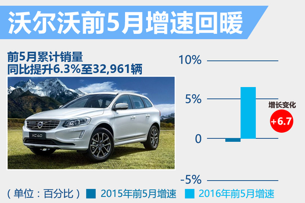 欧系豪华品牌沃尔沃,在各单一市场中,中国单月销量最高。5月份在华销量为7,045辆,较去年同期的6,967辆同比增长1.1%,中国市场为沃尔沃第一大单一市场。前五个月,在华累计销量为32,961辆,较去年同期的31,010辆增长6.3%。