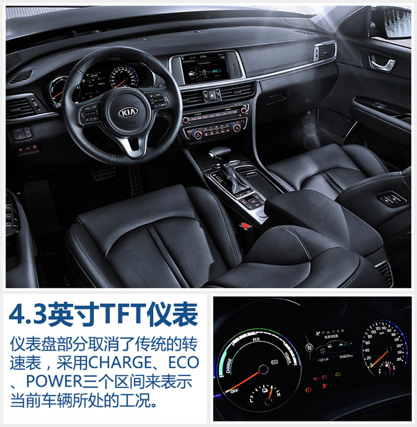 东风悦达起亚K5混动版与普通版车型不同的是,采用4.3英寸TFT仪表盘和8英寸中控屏。ECO等级、能源流程图等一些K5混动版独有的信息也可以通过屏幕显示出来。并且,仪表盘部分取消了传统的转速表,采用CHARGE、ECO、POWER三个区间来表示当前车辆所处的工况。