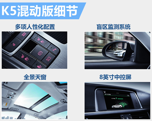 K5混动版车型提供倒车雷达、自动泊车、盲区监测和带有AUTO HOLD功能的电子驻车系统等一系列人性化配置,提升日常使用的便利性。新车还将配有方向盘加热功能,前排座椅也具备加热通风功能,并分为三档可调。后排乘客可以通过老板键来调节副驾驶的座椅的位置,同时全景天窗也会避免后排乘客在长期乘坐时产生压抑的感觉。