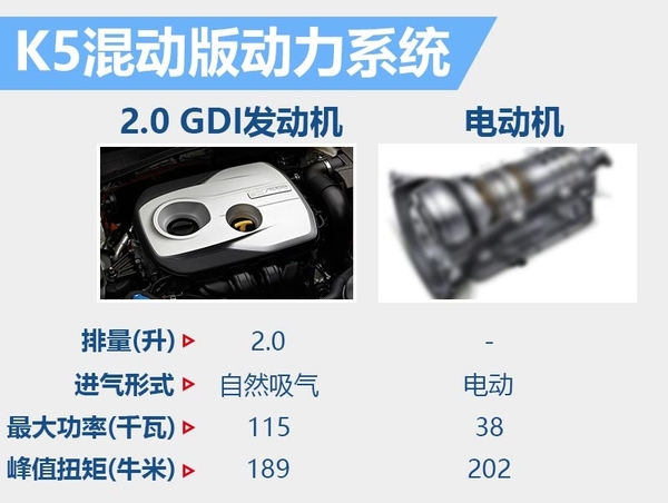 动力方面,K5混动版搭载一套由2.0 GDI发动机+永磁同步电机组成的混动系统。其中,2.0升发动机的最大动率为115千瓦,峰值扭矩189牛米。电动机最大功率为38千瓦;峰值扭矩202牛米。传动方面,新车配备一款6速自动变速箱。