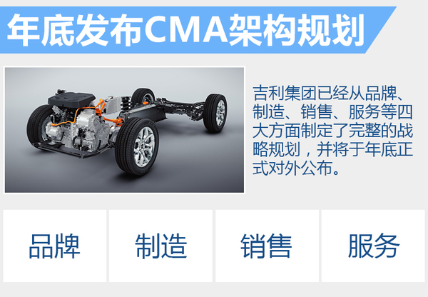 关于CMA平台的规划,吉利集团已经从品牌、制造、销售、服务等四大方面制定了完整的战略规划,并将于今年年底前正式对外公布。安聪慧先生对此表示:基于CMA平台的战略将会为吉利集团未来的竞争力、品牌影响力以及消费者对产品的体验带来巨大的提升。
