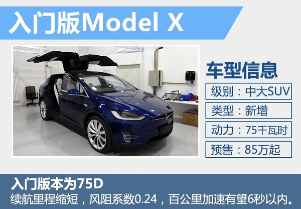 以互联网思维造车的特斯拉品牌入华已三年有余,目前共推出Model S、Model X两款车型。本月24日,特斯拉中国正式向国内车主交付首批Model X车型,车主三年时间的等待也终于收获成果。网通社从特斯拉内部获悉,Model X 将在国内推出一款入门版车型75D,进一步降低新车售价门槛,新车售价有望85万起。