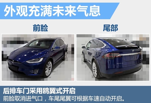 特斯拉Model X作为其品牌首款SUV产品,其定位中大型SUV市场,其车身侧面与MODEl S较为相似,平滑的车顶线条与车尾过渡自然,更像是一辆溜背轿跑车型。该车风阻系数仅为0.24。被誉为未来之车的另一大亮点在于,车辆后排车门采用鸥翼式上扬开启方式,与前排车门常规开启方式形成区分,更具未来感。