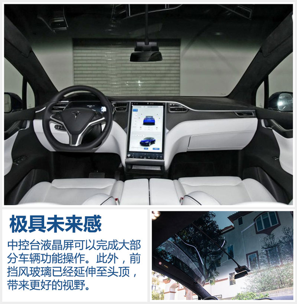内饰部分,MODEL X入门版车型延续了特斯拉家族式设计,而一大块玻璃从车头延伸至头顶,提升视视野同时也符合未来气息。中控台十分整洁,车辆主要功能操作均通过设立在中控台中部尺寸巨大的液晶屏来完成。该液晶显示屏集成了多媒体、蓝牙电话、导航及互联等功能。此外,新车的座椅则采用了常规的“2+3+2式”7座布局设计。
