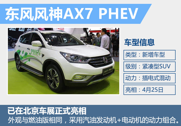 作为东风风神首款SUV产品,AX7同时也是品牌目前的销量主要贡献者。在今年的北京车展期间,东风风神发布了基于AX7打造的PHEV插电混动版车型。AX7 PHEV的外观与传统燃油版相同,预计将在2017年正式投放市场。新车有望采用1.4T涡轮增压发动机+电动机的组合,动力输出有望得到大幅提升,同时燃油消耗预计将进一步下降。