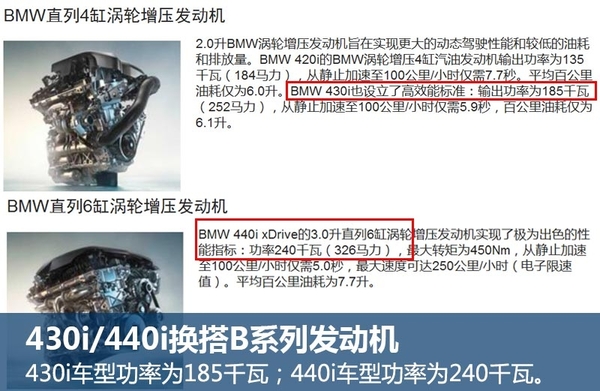 430i车型的最大功率达185千瓦,相比老款428i所使用的N20发动机动力提升5千瓦;440i车型的最大输出功率为240千瓦,峰值扭矩为450牛米,相比老款435i所使用的N55发动机,功率和扭矩数值分别提升15千瓦和50牛米。420i车型动力不变,功率和扭矩数值与现款车型一致。