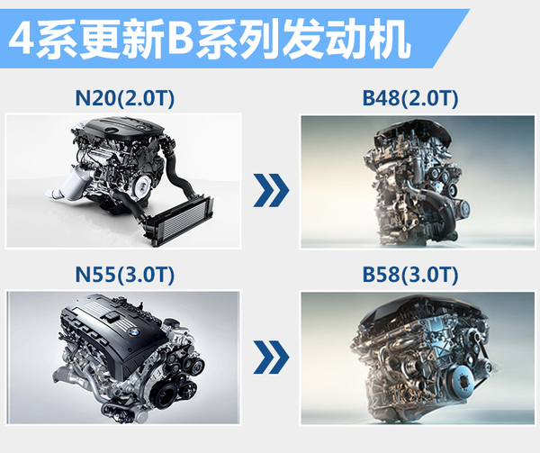 根据官网公布的信息,新款4系的全系车型换搭宝马最新的B系列发动机。其中,全新2.0T发动机则根据功率的不同分为B48B20C(低功率)和B48B20D(高功率)两种,分别搭载在420i和430i车型上。440i车型则搭载B58系列3.0T发动机,取代现有N55B30发动机。