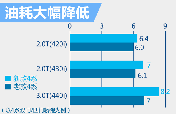新款4系的燃油经济性大幅提升,以4系双门和四门轿跑车为例,现款420i车型百公里综合油耗6.0升,换搭发动机后油耗下降0.4升。现款428i车型油耗为7升,换搭全新发动机后百公里综合油耗为 6.1升,降低0.9升。现款435i车型百公里综合油耗8.2升,换搭全新发动机后油耗降低1.2升至7升。