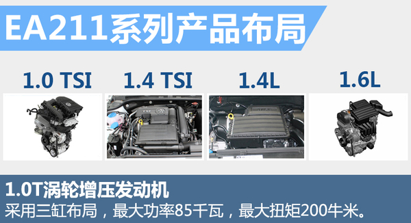 大众EA211发动机引入国内后主要投产了1.4L、1.6L和1.4TSI三种动力引擎,并主要集中在朗逸家族、桑塔纳、斯柯达晶锐、明锐等紧凑级和小型车上。随着国内节能减排和小排量的发展趋势,上汽大众预计还将引入EA211系列中体积更小、能效更高的1.0TSI发动机。