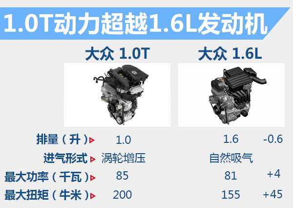 目前海外的新一代Polo等多款小型和紧凑型车中已经使用了大众全新的1.0TSI三缸发动机,其动力表现十分强劲,最大输出功率为85千瓦,峰值扭矩为200牛米,比现款EA211系列的1.6升自吸式发动机的输出功率和峰值扭矩分别高出了4千瓦、45牛米。