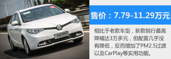 2016款名爵锐行(下文统称新款锐行)最大的变化体现在价格上,新车售价区间为7.79-11.29万,相比于老款锐行,最大降幅将达3万余元,但配置却几乎没有减少反而增加了PM 2.5过滤、CarPlay等实用功能。