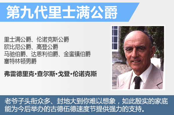 谈到弗雷德里克·查尔斯·戈登·伦诺克斯公爵本人,他的头衔可就多了,此人是里士满公爵、伦诺克斯公爵、欧比尼公爵、高登公爵、马驰伯爵、达恩利伯爵、金銮镇伯爵、塞特林顿男爵,这是多个头衔?我是没心情数,我只是觉得老爷子绝对是个彻头彻尾的大贵族。所以古德伍德速度节的起源简单来说就是有这么一个贵族,有天心血来潮想看赛车,正好有钱、有场地、有传统,于是水到渠成,渐渐演变成了世界最负盛名的汽车文化节日。