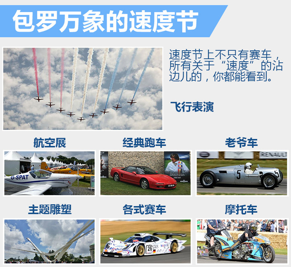 古德伍德速度节的英文为GoodWood Festival of Speed,但凡有点英文基础的就不难从名称中找到“Festival”这个单词——中文的“节日”,这就说明古德伍德速度节并不是一个单纯以比赛为主要目的的节日。对于车迷来说,在古德伍德速度节上能够看到老爷车展、不同年代的F1赛车、知名赛车手、爬山赛以及新车发布。同时古德伍德速度节为车迷家属提供了丰富的表演项目,涵盖了两个轮、四个轮几乎所有的车辆,同时还有专业的飞行表演。