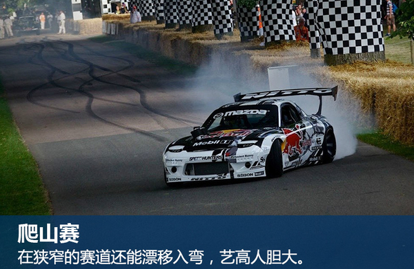 爬山赛是古德伍德速度节的核心节目,为什么用说是节目,因为上文中提到这并不是正规的比赛,爬山赛的赛道长度为1.87公里,全程共有九个弯,高度差为91米,同时也是马奇伯爵的祖父辈们当年玩儿车的地方。参赛车辆需要一直向上爬在最短的时间通过终点,表面上看虽然是一件轻松地事,但是赛道毕竟不是直路,赛车从起点出发后,通过第一个高速弯进入公园直道,穿越古德伍德天桥,以较高速度来到一系列组合弯前。赛车需要减速通过弯角,并紧贴着标志性的砖墙飞驰而过,然后沿着狭窄的山路向终点飞驰。