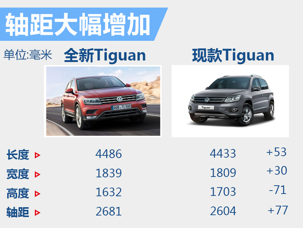 全新一代进口Tiguan的长、宽、高分别为4,486*1,839*1,632毫米,轴距2,681毫米。相比现款Tiguan 4项数据分别增长53、增宽30、增加轴距77毫米,高度降低71毫米。根据以往惯例,全新一代进口Tiguan国产后(也就是全新一代途观)将会有所加长。按此推算,新车不排除有三排7座车型出现的可能。