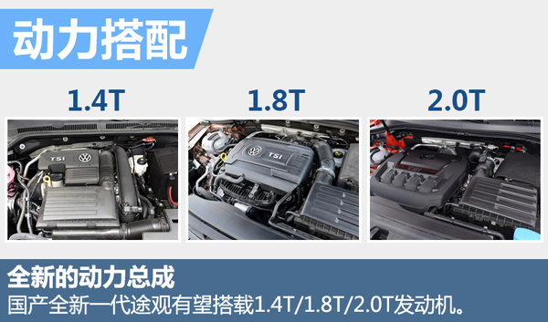 动力方面,国产全新一代途观有望延续海外版Tiguan的动力总成,搭载第三代EA888系列的1.8T、2.0T两款款汽油发动机或一台排量更小的EA211系列1.4T发动机,匹配手动或7速湿式双离合变速箱。