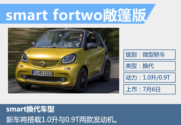根据奔驰产品规划,今年将在华引入超过10款全新或中期改款车型,其中smart占3款。除了刚刚上市的smart forfour,全新smart fortwo敞篷版也即将引入国内。网通社从奔驰官方了解到,全新smart fortwo敞篷版将于7月6日国内正式上市。新车将与smart fortwo采用相同动力系统,搭载1.0升自然吸气和0.9T涡轮增压两种发动机。
