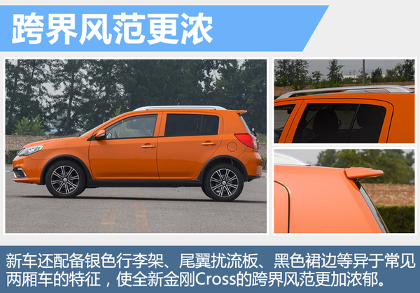 新车还配备银色行李架、尾翼扰流板、黑色裙边等迥异于常见两厢车的特征造型,使全新金刚Cross的跨界风范更加浓郁,也兼有减小风阻的功能。此外,高达180毫米的离地间隙、19°的接近角和33.7°的离去角,赋予全新金刚Cross媲美SUV车型的通过性,跋山涉水不再是难题。