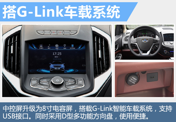 此外在配置上,全新金刚Cross也做出一定升级。中控屏升级为8寸电容屏,同时其内置4G存储空间、支持USB接口和SD扩展卡。指尖轻触屏幕,既可玩转G-link车载智能系统。此外,配置的提升还体现在换挡提醒、多功能方向盘和防夹电动天窗等。