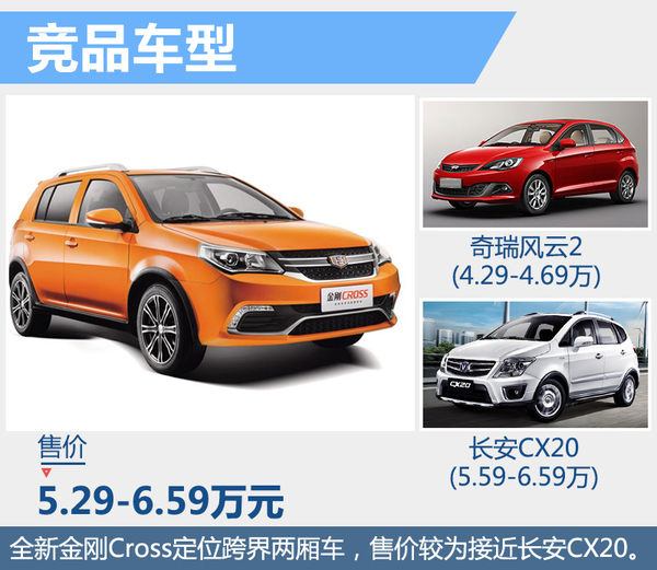 全新金刚Cross定位跨界两厢车,意在满足代步、载货、出游等需求。未来或将与奇瑞风云2、长安CX20等车型展开竞争。同时,全新金刚Cross上市后也将与全新金刚共同助力吉利汽车在A0级家轿市场中抢占更多份额。