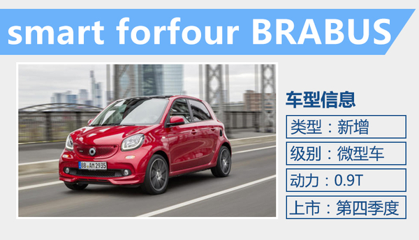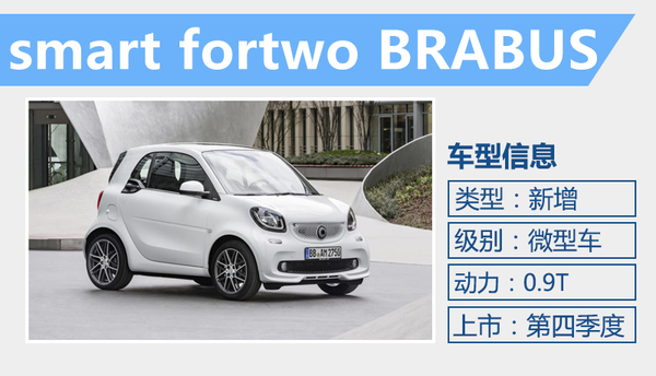三款新车是基于全新smart fortwo、smart forfour打造,由奔驰的御用改装厂BRABUS操刀针对新车外观以及动力进行改装。经过BRABUS所打造的奔驰Smart车型,不仅在动力方面具有显著提升,还更加凸显运动风格,并且在操控性能方面也更为优越。三款新车上市后, smart在华的产品阵容将更为丰富。