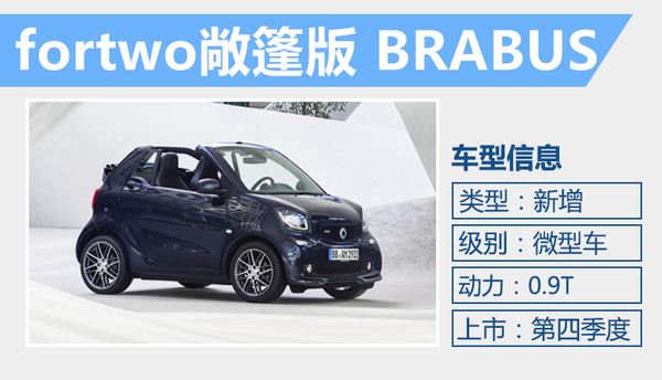 smart fortwo BRABUS、fortwo BRABUS敞篷版以及forfour BRABUS三款车型已于今年四月举行的北京车展实现国内亮相,新车采用了更激进的外观设计风格,以及针对动力系统进行升级。网通社从奔驰smart官方获悉,这三款新车有望于第四季度推出,之后将同步引入中国市场进行销售。