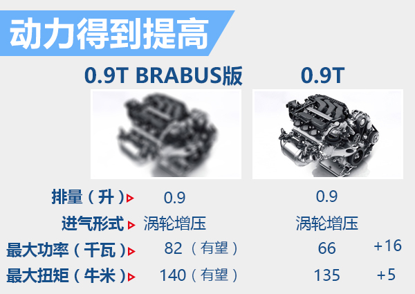 动力方面,三款新车将搭载经过BRABUS重新调校的0.9T直列三缸涡轮增压发动机,与普通版0.9T发动机的最大输出功率66千瓦,最大扭矩135牛米相比,调校过的0.9T发动机最大输出功率可达82千瓦,而最大扭矩也可突破140牛米。传动方面,三款新车有望延续普通版6速双离合的变速箱。