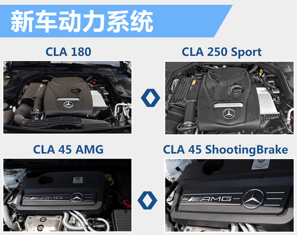动力方面,新款CLA增加了全新入门级车型CLA 180和CLA 250 Sport,分别搭载1.6T和2.0T发动机,最大功率为90千瓦和160千瓦。另外AMG CLA 45和CLA 45 ShootingBrake则搭载全新的2.0T发动机,最大功率207千瓦,峰值扭矩475牛米。传动方面,匹配7速双离合变速箱,标配四驱系统