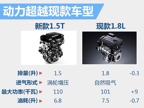 动力方面,新车将搭载一台1.5升直列四缸涡轮增压发动机,并配备一台6速手动变速箱,未来还有望推出搭载自动变速箱车型。这其中,发动机最大功率为102千瓦,综合工况百公里油耗为6.8升。通过与现款搭载的1.8升直列四缸自然吸气发动机相比,新发动机在动力水平上小幅领先,且燃油经济性得到大幅提升。
