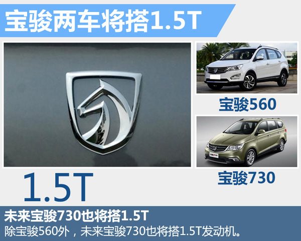 随着国内发动机小排量增压化的趋势,宝骏560将率先搭载1.5T发动机。按照宝骏汽车未来规划,旗下车型730也将搭载这台1.5T发动机。届时,宝骏730的动力将由1.5升、1.8升自然吸气发动机以及新增的1.5T发动机组成,动力将增至3款,给予消费者更多选择空间。