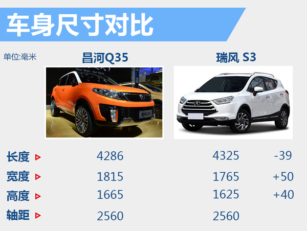 昌河Q35的车身尺寸长、宽、高分别为4286*1815*1665毫米,轴距为2560毫米。瑞风S3的长、宽、高分别为4325*1765*1625毫米,轴距为2560毫米。通过与同级别品牌车型瑞风S3对比后不难发现,Q35车身尺寸宽和高分别比竞品车型高出35和20毫米,但长度上比竞品车型短39毫米。