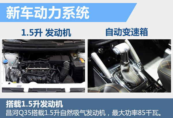 昌河Q35是与绅宝X35同平台打造而来,此外,这款车动力系统也将与绅宝共享,并搭载一台采用北汽动力提供的A151型号1.5升发动机,最大功率85千瓦,最大扭矩148牛米,传动方面有望搭配五速手动和四速自动变速箱。