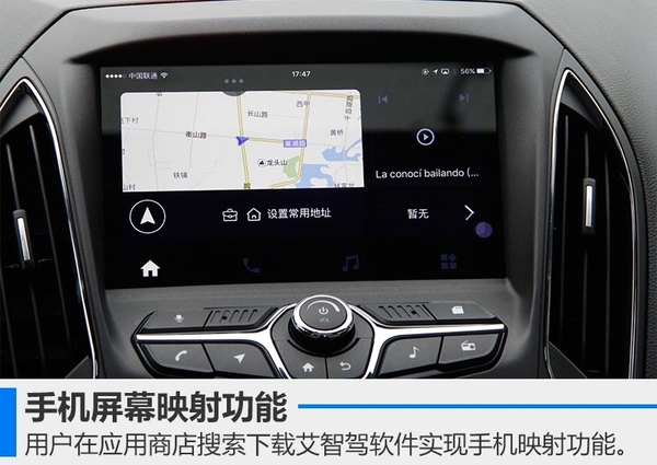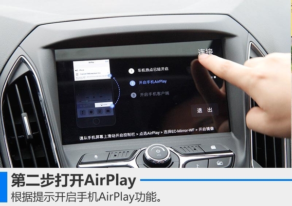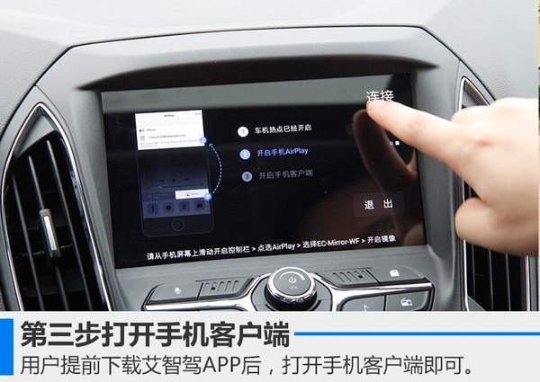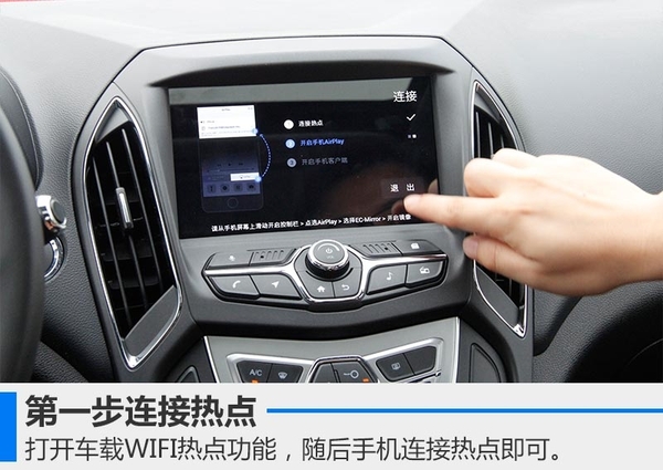 艾瑞泽5手动挡最高配和自动挡次高配、高配车型,配备的是一套支持语音识别功能的多媒体系统。我们体验的是一台自动挡次高配——领臻版,一进入中控台首先映入眼帘的便是8英寸液晶显示屏。在操作体验过程中原车自带的WIFI很好用,除了能够看视频外,还可以获取天气、生活等各方面信息,流量恐惧症患者表示再也不用担心流量问题。车载WIFI还有一个功能便是连接手机投影功能,以苹果ios系统为例,具体操作可分为三步: