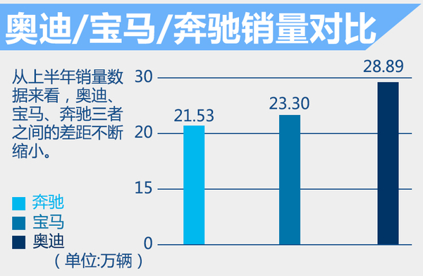 今年1-6月奥迪在华销售288,908辆、宝马在华销售232,997辆、奔驰在华销售215,257辆,其中奥迪品牌继续领跑国内豪华车市场。从账面上看奥迪依然位列销量第一,但是奥迪、宝马以及奔驰三者之间你追我赶的趋势越来越明显,差距也越来越小。