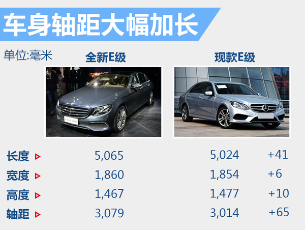 新车基于奔驰MRA(后驱/四驱)模块化平台打造,在设计上更趋向家族化,外观与奔驰S级更加接近。此外,新车还针对中国市场推出长轴距版本,尺寸大幅增加。新车的车身长、宽、高分别为5,065*1,860*1,467毫米,轴距达到3,079毫米。与现款E级相比,车身长度增加41毫米,宽度增加6毫米,轴距长度更是增加65毫米。
