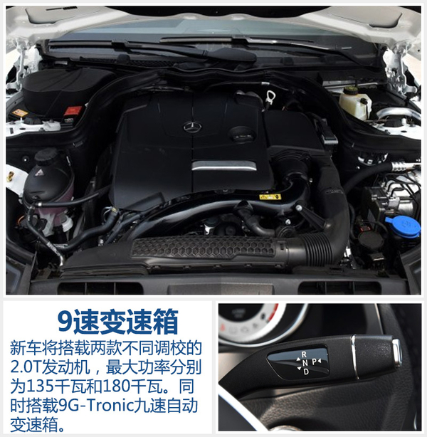 动力方面,新车将搭载两款不同调校的2.0T涡轮增压发动机,2.0T低功率发动机最大功率135千瓦,最大扭计300牛米,2.0T高功率发动机则拥有更强的动力,最大功率180千瓦,最大扭矩达到370牛米。新车配备奔驰9G-Tronic九速自动变速箱,同时后轮驱动也是标配,并提供4Matic四轮驱动供用户选择。