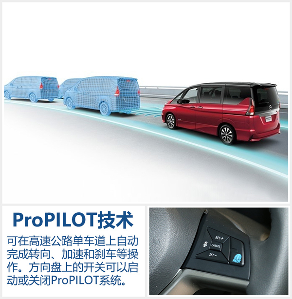 日产ProPILOT自动驾驶技术可用于高速公路上的单车道驾驶,在全自动模式下完成转向、加速和刹车等操作。ProPILOT系统凭借图像处理技术,根据道路和交通状况的变化,进行精准的转向操作。驾驶者可以通过位于方向盘上的开关启动或关闭ProPILOT系统,同时该系统还配有够显示车辆运行状态的个人显示屏能。