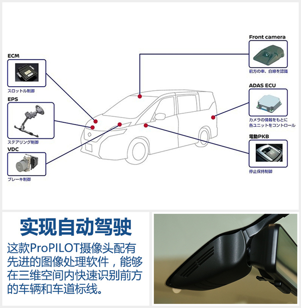 日产ProPILOT系统通过图像处理软件在三维空间内快速识别前方的车辆和车道标线,使车辆在高速公路的车道中间行驶,并且实现对车辆的加速、刹车和转向等操控。这套系统一旦处于启动模式,会根据驾驶者预先设定的速度限制(约为30-100千米/小时)自动控制与前方车辆的距离。
