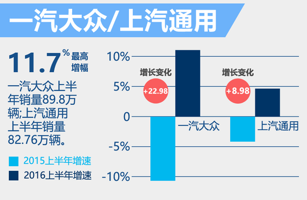 一汽大众今年上半年累计销量89.8万辆,同比增11.68%。与去年同期幅度-11.3%相比,上升22.98个百分点,市场表现较去年有较大提升。同样名次上没有变化;上汽通用今年上半年累计销量82.76万辆,同比增4.88%。与去年同期幅度-4.1%相比,上升8.98个百分点,市场表现也逐渐回暖。名次未发生改变。