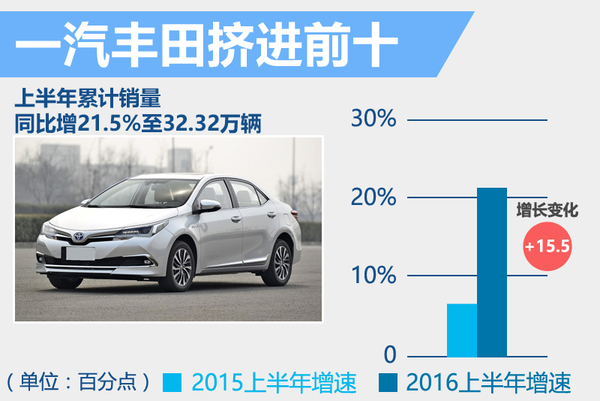 一汽丰田今年上半年累计销量32.32万辆,同比增21.5%。与去年同期幅度6%相比,上升15.5个百分点,市场表现持续攀升,将神龙汽车挤出前十;而神龙汽车今年上半年累计销量28.6万辆,同比下降18.61%,与去年同期幅度2.4%相比,下降21.01个百分点,上半年的销量不景气直接导致其脱榜。