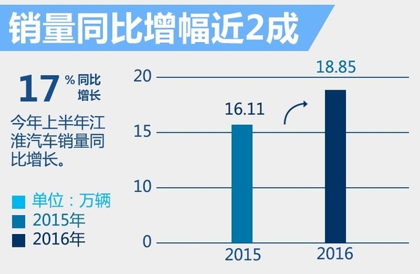 今年江淮汽车将乘用车销量目标定为36万辆,上半年累计销量占今年销量目标的52.3%,今年下半年通过多款新车的集中上市,完成销量年终销量目标不成问题。