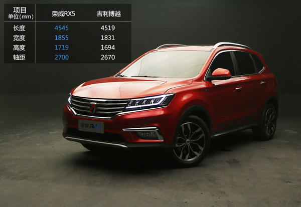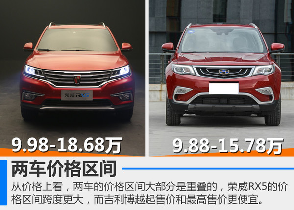 前一阵荣威RX5的上市信息霸占手机屏幕,最终不到10万的起售价确实很够意思。作为首款量产的互联网SUV,共推出两种动力,8款车型,售价从9.98-18.68万元。而当时作为最美中国SUV的吉利博越,也形成了万人期待的态势,当然人们对于美丑总有视觉疲劳,RX5的出现也验证了这一观念,两大中国品牌,同有万人空巷之势,价格又有所重叠,那么它们谁更值得买?谁性价比更高?谁更有竞争力?