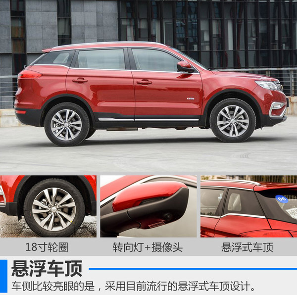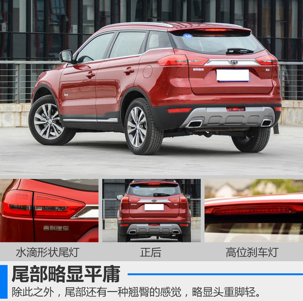 吉利博越外观和博瑞已经统一风格,水滴涟漪中网非常灵动,大量中国风设计细节元素在整个车身体现,侧身线条灵感取自猎豹,腰线上扬富有力量,悬浮式车顶符合当下流行趋势,尾灯采用双C造型,用了LED灯带组,唯一的不足就是尾部的翘臀,有一种头重脚轻的感觉。