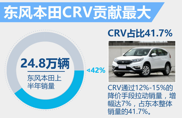 东风本田上半年累计销量24.8万辆,同比增长47.8%。轿车和SUV两大市场出现两极分化表现,思域、哥瑞并没有达到预期效果,究其原因主要在于产能不足,导致轿车进度缓慢,直接影响其销量。SUV市场中CRV通过12%-15%的大幅降价手段拉动销量,增幅达7%,占东本整体销量的41.7%。