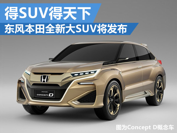 本田在2015年上海车展中发布Concept D概念车,新车采用本田家族式"EXCITING H DESIGN”设计语言。东风本田全新大SUV将基于这款概念车开发,并且将于明年发布。动力方面,新车有望搭载2.0升涡轮增压发动机,最大功率为206千瓦,峰值扭矩达到400牛米。