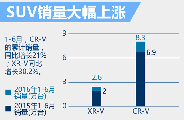 根据中国汽车工业协会统计的数据显示,上半年SUV市场仍然保持着高速增长,累计销量同比增加44.26%。东风本田的两款SUV的销量也是全面提升,逐步成为企业最重要的组成部分。在此基础上,东风本田还将在SUV产品层面继续发力。