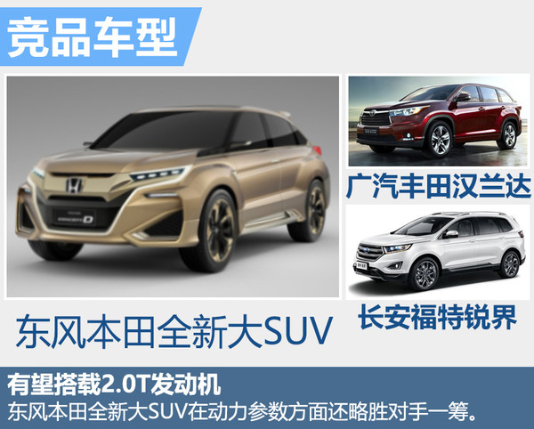 东风本田全新大SUV上市之后,将与广汽丰田汉兰达和长安福特锐界等同级别车型展开竞争。汉兰达和锐界目前都已经搭载2.0T发动机,并且足够满足日常使用需求。东风本田这款全新大SUV也有望搭载2.0T发动机,在动力参数方面还略胜一筹。
