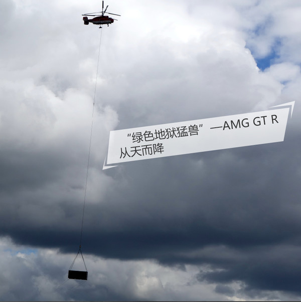 电视大屏幕上打出“绿色地狱猛兽”的字样。伴着轰鸣,阴云密布的天空上,一架直升机由远及近,下面钢索吊着一只大集装箱。箱体着地,从里面开出来一辆绿色宽体跑车——奔驰AMG就是这样向世人展示GT R的身手不凡。在四辆AMG跑车的引导下,绿色的GT R开始在弯道上狂奔,作出种种惊险动作。背景喷出焰火交织出网状,车子停在观众面前,车上走出F1两度冠军——“小黑”哈密尔顿。