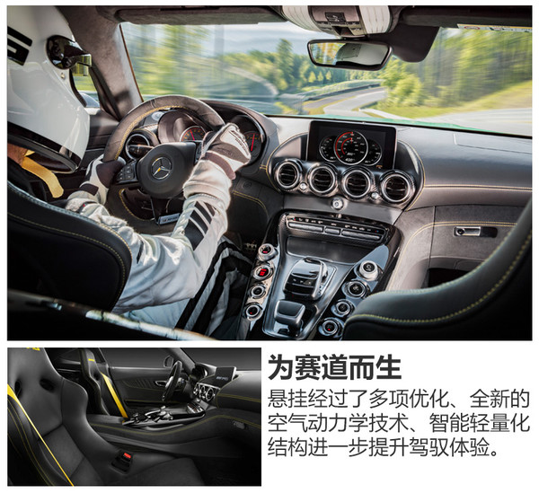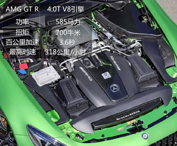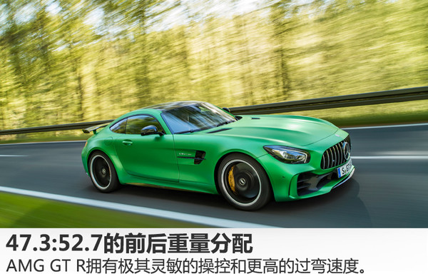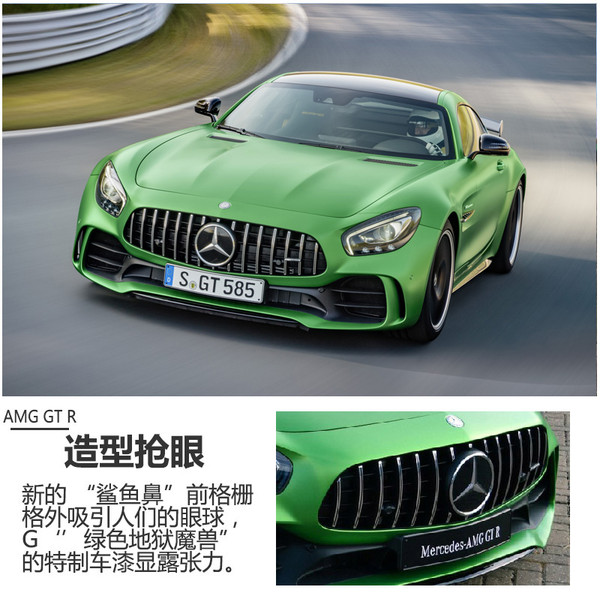 AMG GT R是继GT3之后,AMG车系推出的全新领军车型。585马力的超级动力,3.6秒的百公里加速时间,318公里/小时的极速,这一切都树立了跑车世界的新标杆。悬挂经过了多项优化、全新的空气动力学技术、新的智能轻量化结构,这一切为非凡的驾驭体验进一步提升奠定了基础。由于GT R前后翼子板更加宽阔,可以增加轮距,从而实现最佳抓地力。47.3:52.7这一有利的前后重量分配,加上新车较低的重心,让它获得了极其灵敏的操控和更高的过弯速度。