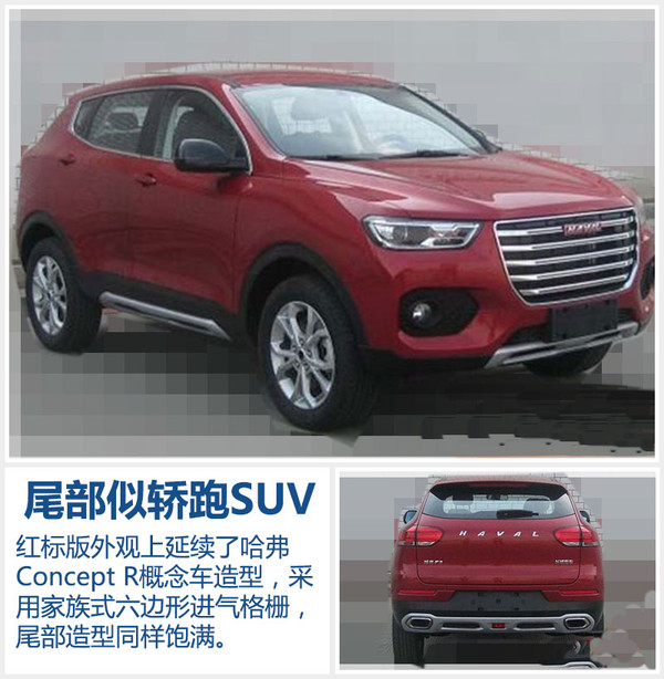 红标版在外观上延续哈弗Concept R概念车造型,具有轿跑风格的设计。前脸采用家族式大尺寸六边形进气格栅,但有与H系列车型有所不同。前大灯造型修长,内部将集成LED灯带,下格栅两侧配备圆形雾灯。新车配备双五辐铝合金轮毂,为整车增添运动感。车侧窗面积较小,营造出运动的车身姿态。车身尾部较为厚重,牌照框放在下保险杠处,保险杠下部银色护板配合双边双出的排气提升了整车视觉效果。